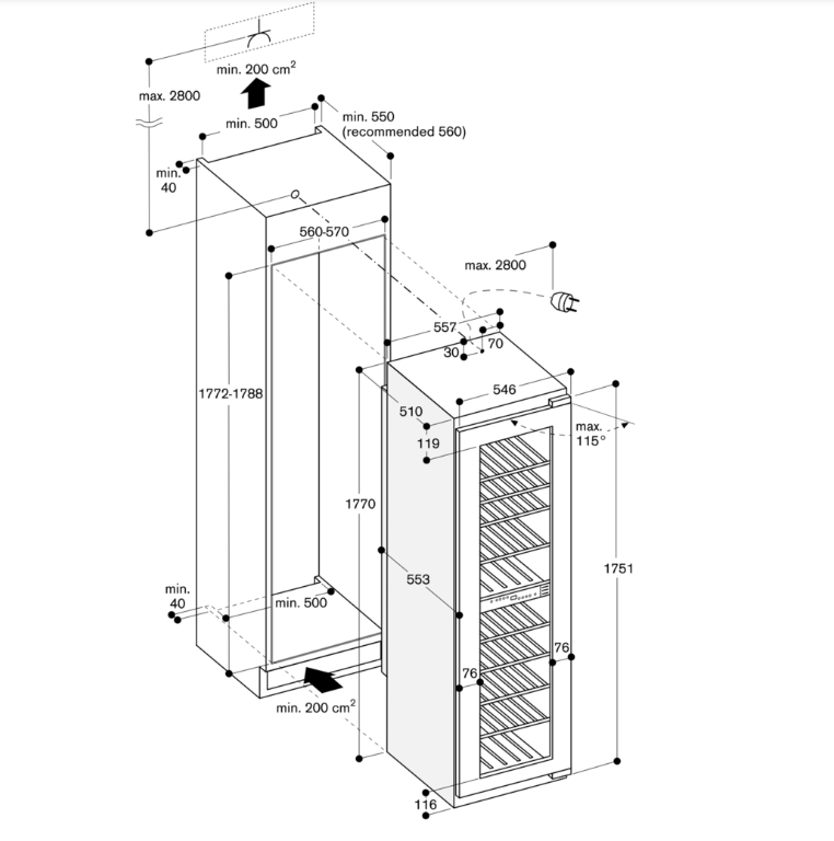 Винный климатический шкаф можно комбинировать со вторым винным климатическим шкафом или исключительно с морозильной камерой (RF 287 или RF 282). При комбинировании винного климатического шкафа с другими холодильными устройствами (RC, RT, RB) между устройствами необходимо соблюдать минимальное расстояние 150 мм во избежание образования конденсата.