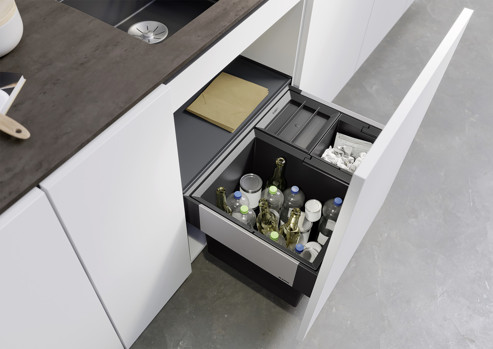 Система сортировки отходов SELECT II XL 60/3 от Blanco воплощает философию бескомпромиссного качества, инновационного дизайна и функциональности, превращая самое активное место на кухне в продуманный, эргономичный и эстетичный центр для приготовления пищи.