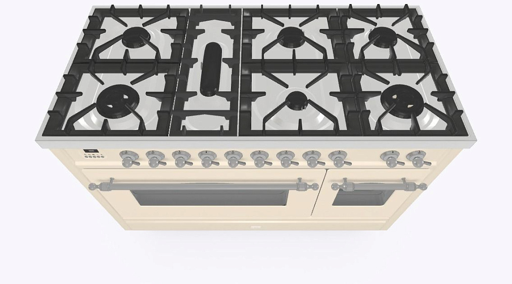 • Тип конфорок: 7 газовых, горелка для рыбной кастрюли, двухконторная конфорка DUAL